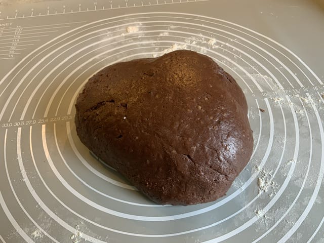 Den Teig noch einmal mit der Hand durchkneten und auf einer bemehlten Fläche ausrollen.
