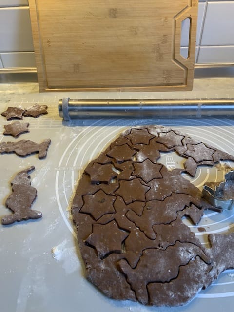 Mit den gewünschten Formen ausstechen und mit genügend Platz dazwischen auf ein Backblech legen. Die Lebkuchen gehen während des Backens auf.