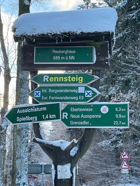 Am Rennsteig angekommen gab es das obligatorische Foto und einen kurzen Spaziergang durch den Winterwald. Es ist hoffentlich nicht der einzige Schnee, den wir diesen Winter zu sehen bekommen.