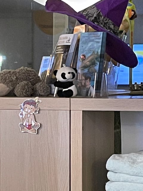 Nun noch eine herzzerreißende Geschichte zum Abschluss des Urlaubs: Vor drei Tagen ging im Gedränge des Fahrstuhls mein Klammer-Panda aus China von meinem Rucksack verloren. Ich habe fast geheult. Heute am Popcorn-Automaten vor der Gästeinfo fällt der Blick meines Mannes auf das Regal in der Info. Und wer sitzt dort? Mein Panda. Neben einem anderen Fundtier unbekannter Art. Jetzt habe ich ihn wieder und er kann mit mir nach Hause fahren.