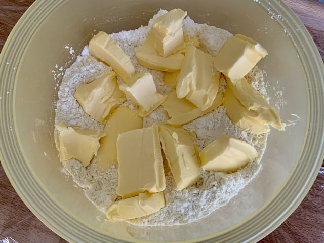 Mehl und Puderzucker in eine große Schüssel sieben. Backpulver und Salz dazu. Die zimmerwarme Butter in kleinen Stückchen mit der Hand einkneten.