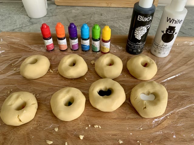 Wenn der Teig wie Knete ist, je nach Anzahl der Farben in mehrere Stücke teilen. Die Farben nach Anleitung dazugeben und einarbeiten.