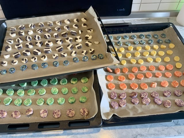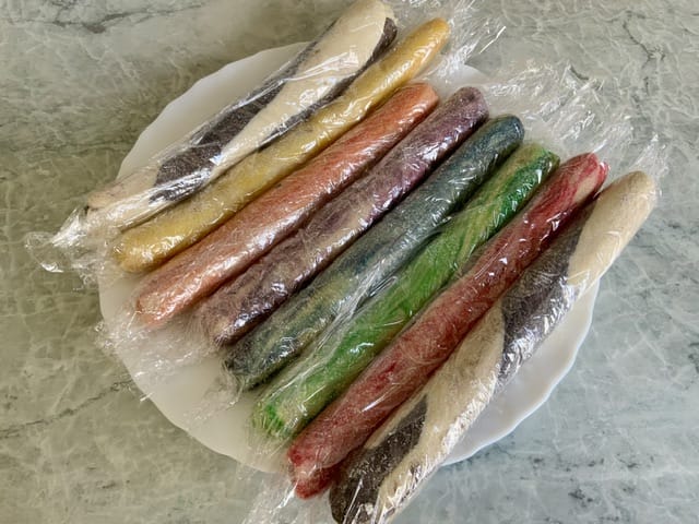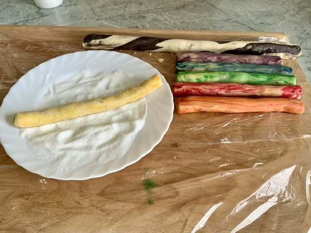 Anschließend den Teig zu Rollen formen und in Zucker oder bunten Streuseln wälzen. In Folie wickeln und mindestens 30 min in den Kühlschrank stellen.
