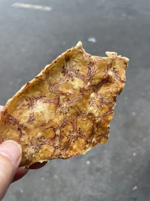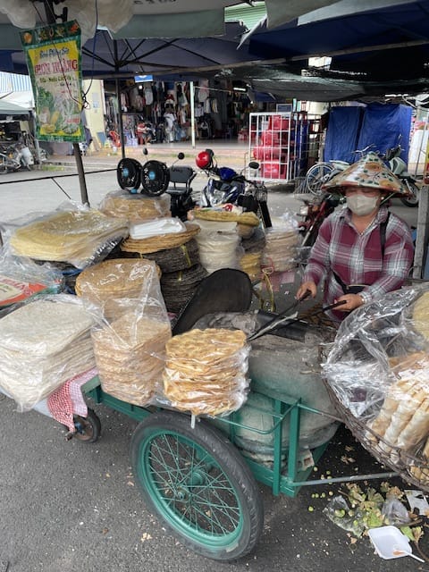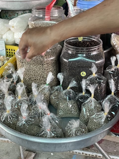 Natürlich probierten wir uns weiter durch die vielen Köstlichkeiten des Marktes. Besonders das Bananenbrot war köstlich. Alles, was im Mekong-Delta wächst, schien hier vertreten zu sein, vieles davon hatten wir noch nie gesehen, etwa Tamarinde. Da wir ohnehin Pfeffer kaufen wollten, nutzten wir die Gelegenheit sofort: je ein Beutel schwarzer und weißer Pfeffer für nur einen Euro.