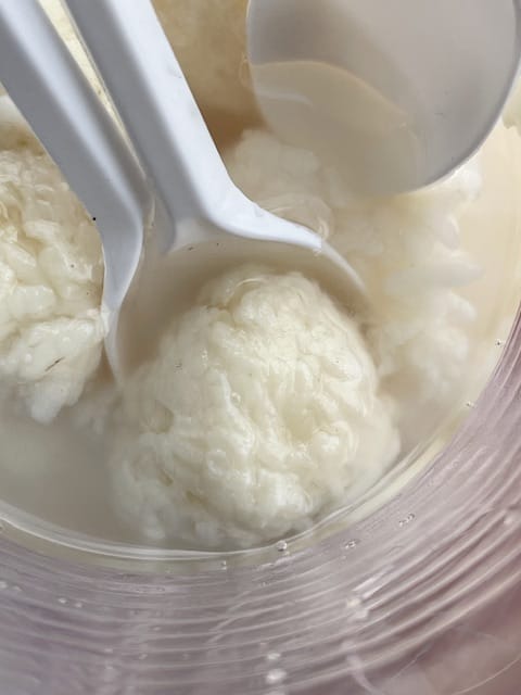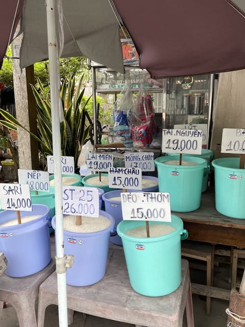 Danach führte uns der Weg in eine Marktstraße. Direkt beim Aussteigen standen wir vor einem Geschäft mit vielen Särgen, hoffentlich kein schlechtes Omen. Der Markt selbst war angenehm ruhig, sodass wir alles in Ruhe bestaunen konnten. Zahlreiche Reissorten wurden angeboten. Auch eine besondere Spezialität: weißer, mit Hefe fermentierter Klebreis. Sein Geschmack war leicht säuerlich und gärig. Er wird zur Herstellung alkoholischer Getränke und von Kuchen verwendet und soll zudem sehr gesund sein.