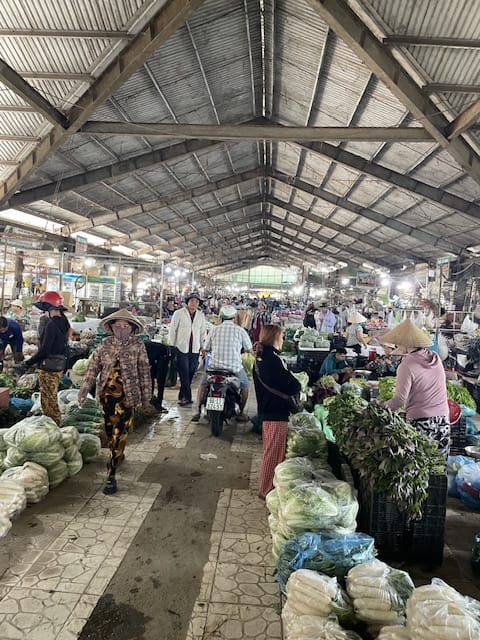 Weiter ging es vorbei an den Ständen mit lebenden Tieren. Viele verschiedene Küken warteten auf Käufer. Da in Vietnam fast alles gegessen wird, gab es auch Frösche, Schlangen, Fische und Schildkröten in allen Variationen zu sehen. Eklig finde ich allerdings angebrütete Eier. In der großen Markthalle waren nur wenige Fußgänger unterwegs, stattdessen fuhren Mopeds und Motorräder direkt zwischen den Marktständen hindurch und kauften vom Moped herab ein.