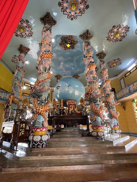 Der Tempel selbst ist eine faszinierende Mischung aus katholischer Kirche, Moschee und asiatischer Pagode. Die Architektur vereint westliche und östliche Elemente auf eine Weise, wie ich sie nicht kannte.