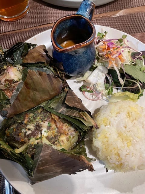 Bevor wir uns ins Getümmel stürzten, kehrten wir in ein kleines, aber sehr gutes Restaurant ein. Dort bestellte ich gedünsteten Fisch, serviert in Bananenblättern – ein echtes Highlight. Der Fisch war wunderbar zart und mit verschiedenen Pfeffersorten und frischen Kräutern raffiniert gewürzt. Kaum zu glauben, dass dieses geschmackliche Erlebnis umgerechnet nur etwa 7 € kostete.
