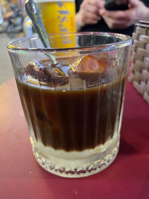 Eine besondere Entdeckung des Abends war der weiße vietnamesische Kaffee. Unten eine dicke Schicht gezuckerter Kondensmilch, darüber kalter, kräftiger Kaffee mit Eiswürfeln – süß, stark und unglaublich erfrischend zugleich. Ein Geschmack, der mir definitiv in Erinnerung bleiben wird.