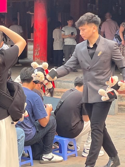 Vor Ort war erstaunlich viel los: Zahlreiche Schulklassen nutzten die eindrucksvolle Kulisse für Fotoshootings. Besonders beeindruckend war eine zwölfte Klasse, die ein traditionelles Weihrauchritual durchführte – ein stiller, respektvoller Moment, der die Bedeutung von Bildung und Tradition spürbar machte. Danach bekamen alle Schüler einen kleinen Plüsch-Teddy mit Doktorhut als Andenken.