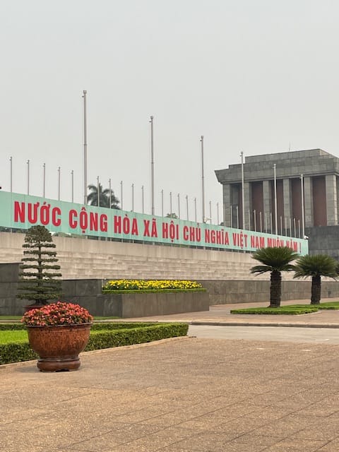 Im Mausoleum selbst bewegten wir uns zügig an dem aufgebahrten Ho Chi Minh vorbei – ein stiller und respektvoller Moment. Danach spazierten wir noch durch den Park und besichtigten sein schlichtes Stelzenhaus, das überraschend einfach eingerichtet ist. Auch die Einfahrt zum Präsidentenpalast konnten wir sehen.
