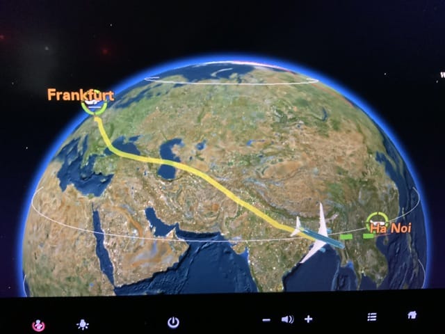 Der Flug mit Vietnam Airlines startete pünktlich in Frankfurt – was in diesem Fall tatsächlich keine große Kunst war, da Lufthansa gerade streikte und der Flugverkehr ohnehin ausgedünnt war. So hoben wir entspannt zu unserem rund zehnstündigen Flug in einer Boeing 787-9 ab. Die Route führte uns über große Teile Europas und Asiens: über Tschechien, Österreich, Ungarn und Rumänien, weiter über das Schwarze Meer, Armenien und Aserbaidschan, dann über das Kaspische Meer und Turkmenistan bis nach Afghanistan, Pakistan und Indien. Schließlich überquerten wir Bangladesch, Myanmar und Laos, bevor wir unser Ziel Vietnam erreichten.