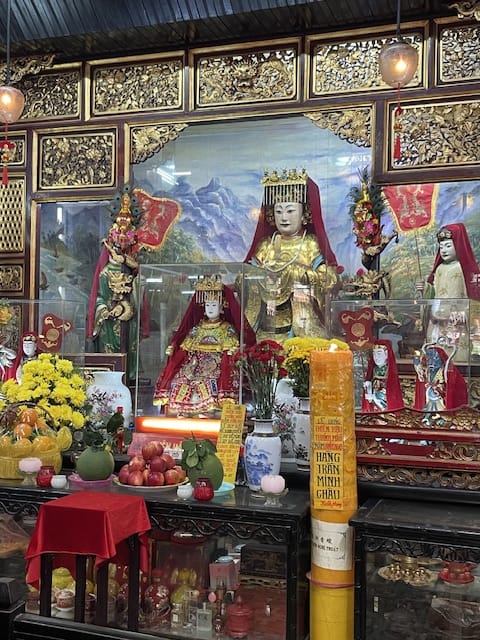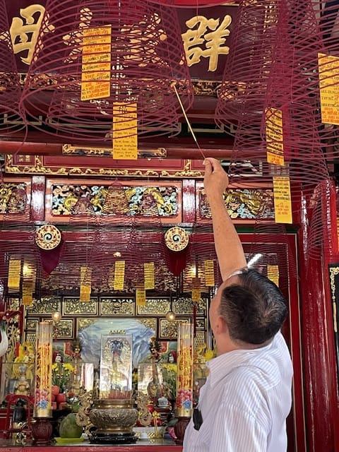 Da früher viele Chinesen hier lebten, gibt es bis heute eine prachtvolle chinesische Pagode mit zahlreichen Götterfiguren. Die chinesische Gemeinschaft spendet dort großzügig und hofft, dass ihre Wünsche in Erfüllung gehen. Sehr berührend war der Anblick einer jungen Frau, die verzweifelt vor der Göttin der Fruchtbarkeit betete. Überall hingen spiralförmige Räucherstäbchen von der Decke, die etwa einen Monat lang brennen. Sie werden gegen Spenden erworben.