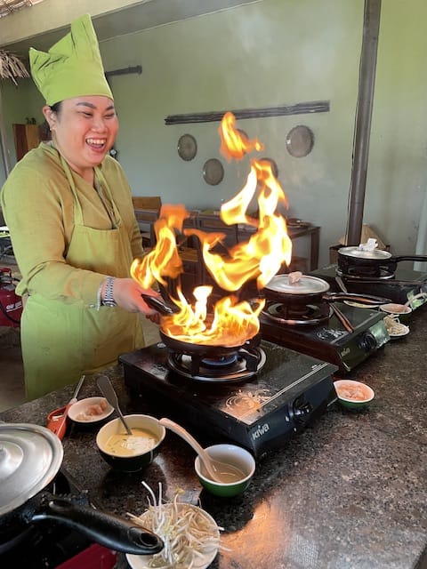Später ging es weiter zu einer Kräuterfarm. Dort wurden wir überraschend mit einer Fußmassage empfangen, bevor wir unser eigenes Essen zubereiten durften. Das erste Omelett brutzelten wir selbst in der Pfanne, aber zum Glück gab es noch mehr zu essen.